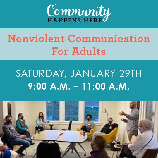 Nonviolent Communication for Adults Saturday, January 29, 2022 9:00 AM 11:00 AM Community Happens Here 6238 Montgomery Road Cincinnati, OH, 45213 United States (map) Google Calendar ICS Learn how to say what you feel and what you need in a way that makes others want to cooperate. This interactive workshop features insights from Marshall Rosenberg’s bestselling book that’s sold over 5 million copies worldwide. Register Here